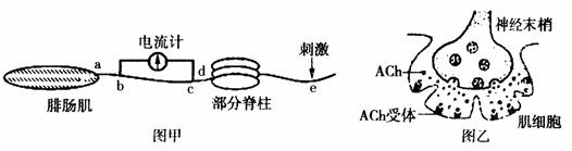 32.(14分)图甲表示从青蛙体内分离出一部分新鲜的腓肠肌及相连的部分神经组织,图中a为神经纤维与腓肠肌细胞的连接处。图乙是图甲中a部位的扩大图,其中Ach(乙酰胆碱)是一种兴奋型递质,当兴奋传到传出神经末梢时,Ach与Ach受体结合,引起肌肉收缩。(假设在实验过程中,适宜条件下肌肉和神经组织均能保持正常的结构和功能。)利用上述材料做了如下一些实验:![]()