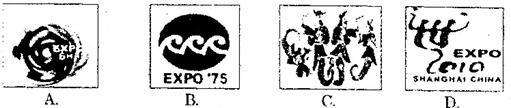 6.即将举办的中国上海世博会会徽形似汉字“世”,且与举办年份的数字组合巧妙,三个人形,既代表三口之家,也代表“你”、“我”、“他”及全人类,表达了中国人民把这届世博会办成人文思想、属于世界、多元文化融合的博览盛会的强烈愿望。据此判断,下列图片哪一个最有可能是上海世博会的会徽