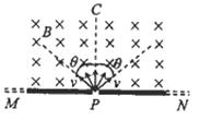 如图,在屏MN的上方有磁感应强度为B的匀强磁场,磁场方向垂直纸面向里。P为屏上的一小孔。PC与MN垂直。一群质量为m、带电量为-q的粒子(不计重力),以相同的速率v,从P处沿垂直于磁场的方向射入磁场区域。粒子入射方向在与磁场B垂直的平面内,且散开在与PC夹角为θ的范围内。则在屏MN上被粒子打中的区域的长度为