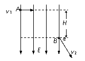 空间某区域存在竖直向下的匀强电场,电场线分布如图所示。带电小球质量为m,电量为q,在A点速度为v1,方向水平向右,至B点速度为v2,v2与方向水平的夹角为α,A、B间的高度差为H。以下判断正确的是
