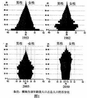 图1是中国1953年至2050年不同年份统计及预测的人口年龄结构金字塔,读图完成1-2题。