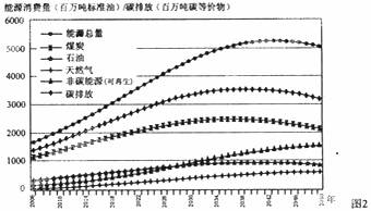 能源消费所产生的碳排放(二氧化碳排放)是经济发展过程中不可避免的副产品。图2是基于我国目前能源结构变化趋势模拟得到的未来各种能源消费量及碳排放量情况。读图回答3-4题。