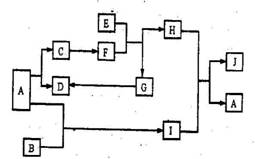 9、(5分)下图是初中化学中常见物质间的转化关系,其中C、D、G为单质,且G是目前世界年产量最高的金属,其余为化合物。A是地球上最多的液态氧化物,F与H的组成元素相同。J不溶于水,是常见的重要的建筑材料(反应条件、部分反应物和生成物均已略去)。