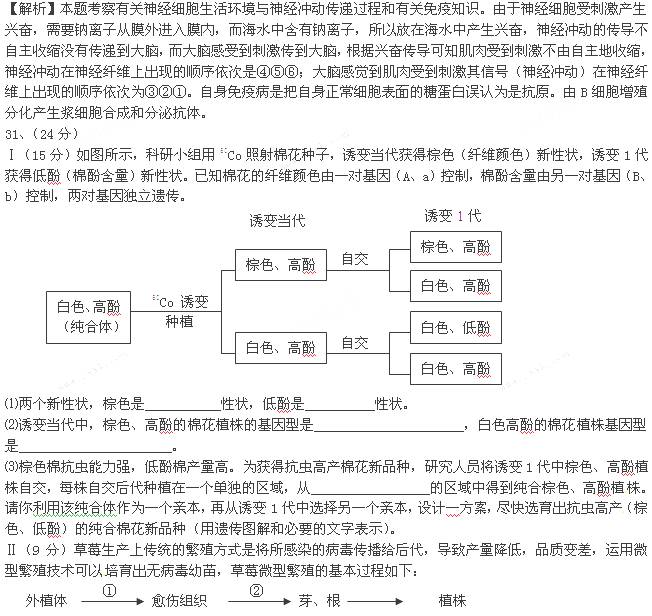 白色、高酚因此棕色是显性,亲代白色、高酚自交后代是白色、低酚,白色、高酚因此低酚是隐性。诱变当代中,棕色、高酚的棉花植株的基因型是AaBB,白色高酚的棉花植株基因型是aaBb,纯合体后代不发生性状分离,因此应从不发生性状分离(或全为棕色棉或没有出现白色棉)的区域中选择出纯合棕色、高酚植株。育种时间短应选择单倍体育种方案。Ⅱ培育无病毒植株苗,应选择不含病毒部分培养,而植物体新生部位不含病毒,植物组织培养培养基成分应包含大量元素、微量元素、有机物,另外常常需要添加植物激素诱导植物细胞分裂、分化,外植体边缘局部污染,说明消毒不彻底,不同植物激素的比例影响植物细胞发育方向,生长素用量比细胞分裂素用量,比值高时,有利于根的分化、抑制芽的形成,比值高低,有利于芽的分化、抑制根的形成。