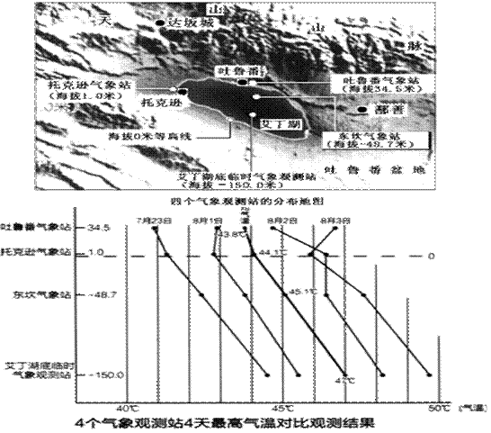 (2)据图分析吐鲁番地区日最高气温的分布特征?历史上,吐鲁番气象观测站两次出现47.7℃的高温,请结合图中的气温观测资料分析艾丁湖底可能达到的最高气温?(9分)