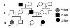 A.甲病为常染色体上的隐性遗传病,乙病为红绿色盲 B.Ⅲ13个体乙病基因只来源于I2