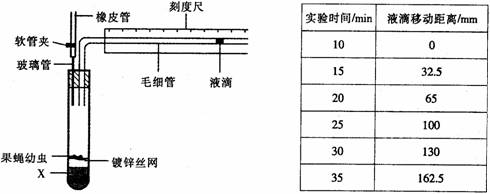 5.某同学用下图所示实验装置测定果蝇幼虫的呼吸速率。实验所用毛细管横截面积为1mm2,实验开始时,打开软管夹,将装置放入25℃水浴中,10min后关闭软管夹,随后每隔5min记录一次毛细管中液滴移动的位置,结果如下表所示。下列分析中,正确的是( )