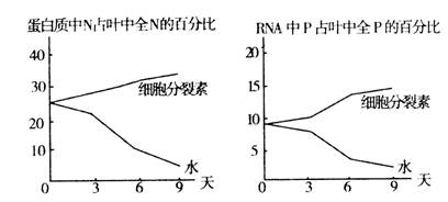 4.植物细胞衰老时,细胞内蛋白质和RNA的总量均会下降。现有一个完整的烟草叶片,一半用细胞分裂素处理,另一半用水处理,放置暗处一段时间,测得叶片中RNA和蛋白质的含量如图所示。请推测以下叙述不正确的是: