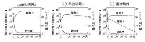 Tilman等人研究了两种淡水硅藻的种群增长。硅藻需要硅酸盐作为其细胞壁的原料。实验中不断地定期加硅于培养液中。实验中同时记录了硅藻密度和硅浓度的变化。两种硅藻单独培养(a、b图)和混合培养(c图)的种群变化曲线如图所示。据图分析,以下叙述中错误的是