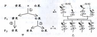 A.由图甲①②可知黄果是隐性性状,由图乙可知花的着生位置由细胞核基因控制
