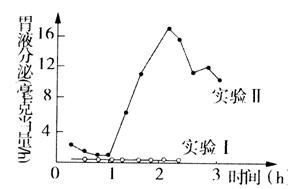 右图是对一位患有食道狭窄症的妇女所进行的实验结果。实验I让该妇女吃400克麦片粥,但该妇女明显对片粥厌恶;实验II让该妇女吃自选喜欢的食物如新鲜蔬菜、沙拉、牛奶、土豆、炸鸡腿、鸡蛋、蛋糕等。两次实验中食物经咀嚼品尝后都没有进入胃内。