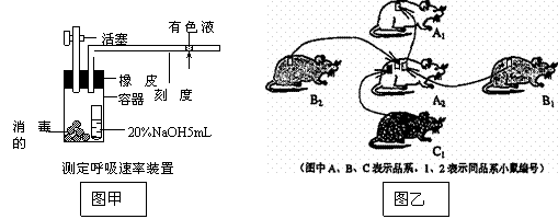 6.图甲是一种可测定呼吸速率的密闭系统装置。图乙是用A、B、C三个纯种品系的小鼠进行皮肤移植实验,移植时,在某小鼠背部切除部分皮肤,将其他个体的皮肤移植上去。请据图回答下列问题: