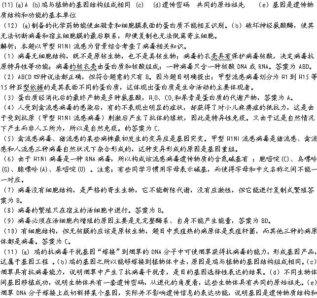 (12)(a)血凝素能和细胞膜上的蛋白结合,在细胞膜上打开一个通道,使得病毒能进入细胞。所以制备的药物须能使血凝素和细胞膜表面的蛋白质不能相互识别。(b)神经氨酸酶通过“水解”的方式切断病毒和宿主细胞膜的最后联系,使病毒脱离寄主细胞,再次去寻找感染下一个目标。所以制备的药物不能须不能使神经氨酸酶发挥作用,即使之水解。
