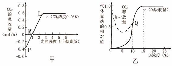 (1)甲图中M点的含义是 。在L点时植物光合作用消耗的二氧化碳是 mol/h。