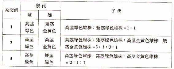 (2)如果让第3组子代的高茎绿色雌株与高茎金黄色雄株杂交,其后代表现型是 ,对应的比例为 。(2分)