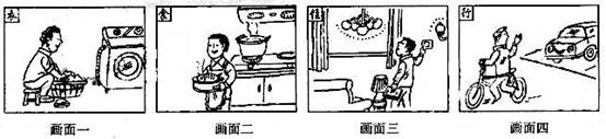 22.欣赏漫画《低碳生活》(“低碳生活”指低能耗、低污染、低排放的生活方式)。请仿照画面二、三的文字,补写其余两处。要求:①进口画面内容;②写两个5字句;③句末押韵。(4分)