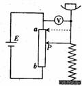 (6分) 图示为某同学在探究活动中设计的一种电子秤,已知电源的电动势为E,内阻不计,电阻分布均匀的可变电阻总长为L,总电阻为R,弹簧的劲度系数为k,连接电压表的导线可自由伸缩,不测量时指针P在a处(如图中虚线所示),使电压表的示数与所称重力对应便成为电子秤。