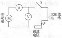 太阳能电动车,它由太阳能电池提供动力,右图是它的电路简化图,光能转化为电能储存在太阳能电池中,提供电动机转动需要的动力,可通过改变调速电阻来调节电动机转速。已知太阳能电池电压为600V。请回答以下问题: