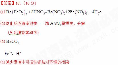 [解析]本题主要考查的是无机化工流程的分析,此题为化工生产题型,主要考察了化合物性质。(1)Ba(FeO2)2与HNO3反应,生成对应的硝酸盐;(2)控制温度,不用浓硝酸的目的是控制反应速率,防止反应速率过快;同时浓硝酸容易挥发分解;(3)通过产物,结合溶液的酸碱性,选用的X为BaCO3,在I中有Fe3+、H+和Ba2+、NO3-等,加入BaCO3后,能使Fe3+和H+浓度降低;(4)在废渣中有可溶性钡盐,有毒,因此,洗涤的目的是减少可溶性钡盐对环境的污染。