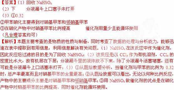 ③与浓硫酸催化甲苯硝化相比,NaHSO4催化甲苯硝化的优点有_ 、 。