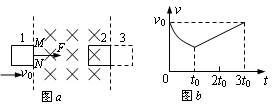 如图a所示,在光滑水平面上用恒力F拉质量m的单匝均匀正方形铜线框,边长为a,在1位置以速度v0进入磁感应强度为B的匀强磁场,并开始计时t=0,若磁场的宽度为b(b>3a),在3t0时刻线框到达2位置速度又为v0,并开始离开匀强磁场。此过程中v-t图象如图b所示,则( )