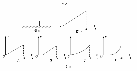 如图a所示,物块静止在粗糙水平面上。某时刻(t=0)开始,物块受到水平拉力F的作用。拉力F在0-t0时间内随时间变化情况如图b所示,则在这段时间内物块的速度随时间变化的图像可能是图c中的![]()