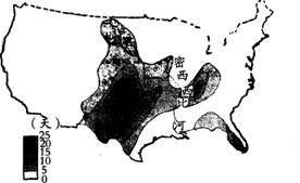 下图是美国20世纪30年代某灾害分布示意图,完成32-34题。(发生天数最多处不临海)