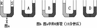 9.U型管中装有两种不同浓度的溶液R及S(溶质为大分子物质),并为一半透性膜(X)隔开(如下图)。与S相比,R为低渗溶液(即浓度较低)。图a中黑色的深浅即代表浓度高低。开始如图a所示,15分钟后,当图中的U形管内已达到平衡时,问溶液表面是一样高还是不一样高?渗透压是相等还是不相等?(参看图b) ( )![]()