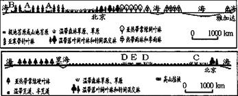 下面两图中,上图为从雅加达到北京附近沿经线的植被分布示意图,下图为经北京附近沿纬线的植被分布示意图。回答47-49题。