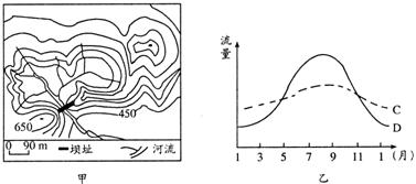 (1)甲图中水库坝址选在峡谷的理由是 。