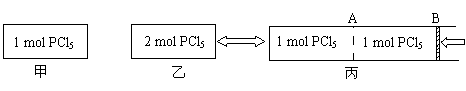 1.平衡向左移动了。理由:再向容器中加入1 mol PCl5,和开始加入2 mol PCl5达到平衡时的效果一样。容积固定的密闭容器中,成比例的增大反应物的量,相当于加压过程(图示中乙容器充了2 mol PCl5,等价于丙容器充入2 mol PCl5达到平衡后,将活塞从B推至A处),所以加压平衡向左进行。