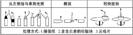 [易错点评] 由于对胚芽鞘的处理方式较多,如全光、单侧光、遮光、切除尖端、插云母片、旋转、横放等,导致学生对胚芽鞘生长状况的判定有些混乱。要作出正确判断,需弄清三个部位:生长素的产生部位--尖端,所以胚芽鞘是否生长,先看是否有尖端,若无尖端,要看是否有外源生长素的添加。胚芽鞘的感光(重力)部位--尖端,这涉及到生长素的横向运输。生长素是否分布不均,要看尖端是否感受到了单一方向的刺激,若有,则遵循“向光、重力或离心力方向横向运输”来判定。生长素的作用部位--(形态学的)尖端下部,这涉及到生长素的纵向运输,若上端的生长素分布不均,或用云母片等阻断了纵向运输途径,则哪侧生长素较多哪侧生长就快。注意三部位在胚芽鞘生长中的作用,并结合影响两种运输途径的因素,进行综合分析。常见处理如下图所示(箭头为生长方向):