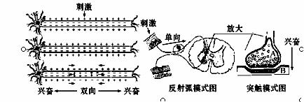 [易错点评] 由于教材中给出的“神经纤维的传导模式图”中,刺激的是剥离了神经胶质外鞘的神经纤维,实验条件下刺激神经纤维的中部,在刺激部位形成了局部电位变化,引起电荷移动,导致受刺激部位与两侧的相邻部位形成局部电流回路,使兴奋向两个方向传导。而在正常状况下,一般接受刺激的是皮肤或黏膜内的神经末梢,刺激来自于神经细胞的一端而不是中部,所以,此时的兴奋在神经纤维上的传导是单向的。可结合反射弧进行分析。