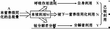 能量在相邻两个营养级之间的传递效率为N/A×100%,而不是N/M×100%。未被利用的(M)是指:本营养级同化的总能量(A)-呼吸作用消耗的能量(X)-被分解者利用的能量(Y)-流入下一营养级的能量(N)。