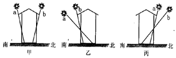 甲、乙、丙是三幅地处不同纬度的三座房屋两至日的阳光照射情况(a或b),读图后回答16-18题