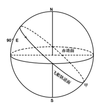 截止到了008年9月25日,我国自行研制的“神舟”飞船已经七次发射成功,从神五到神七先后将六名宇航员送入太空。假设飞船高空飞行时,轨道倾度(轨道平面与地球赤道平面的夹角)约42°,飞行高度约343千米,飞船运行周期约90分钟,图中“飞船轨道面”是飞船在地面的投影,结合图3,回答7-8题。(地球半径为6370km)