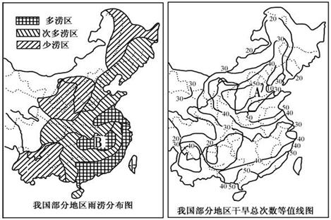 32.读《我国部分地区雨涝分布图》(图14)和《我国部分地区干旱总次数等值线图》(图15),结合所学知识回答下列问题。(8分)
