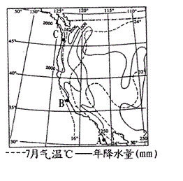 ⑴据图可知,A、B、C三地降水量差异较大,试从大气环流的角度分析其形成原因。(3分)