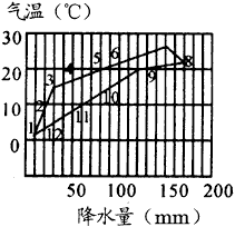 读右图,完成13-14题(图中各数字代表该点的月份)