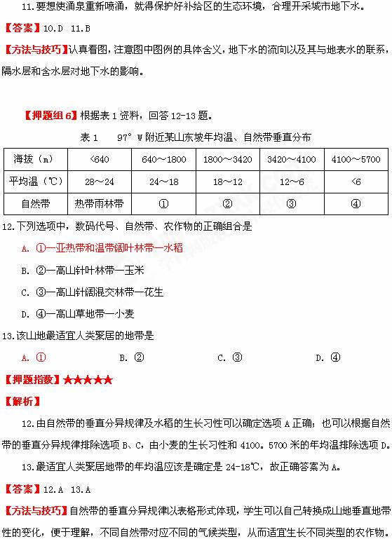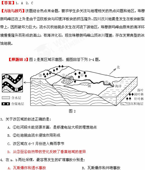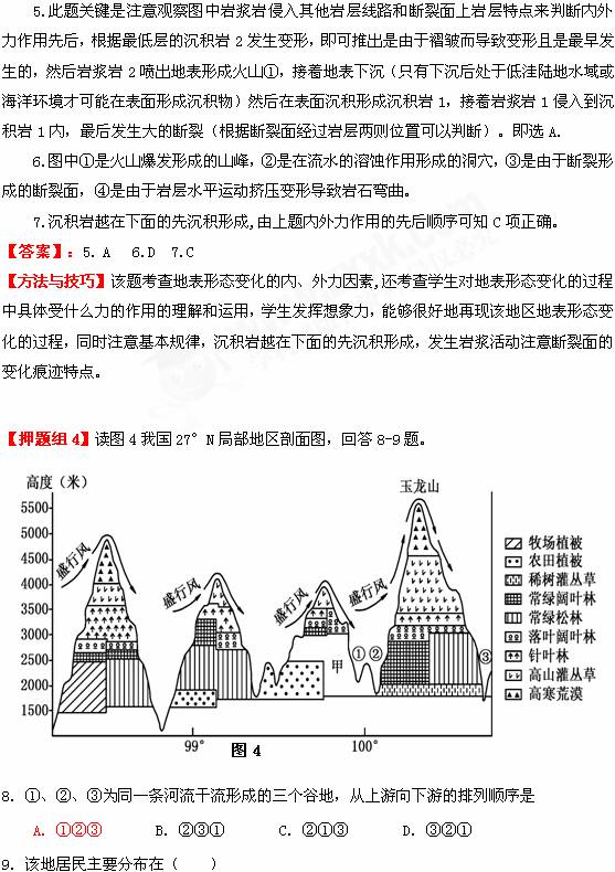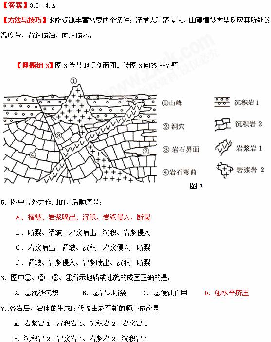 3. ①处河段落差大,但流量不大,水能资源不丰富,②处地貌由流水堆积作用形成,图中山麓植被是落叶阔叶林,该区域处于温带地区,没有梅雨现象,梅雨是指在亚热带的长江中下游地区出现多雨现象,垂直地带性规律可知D正确。