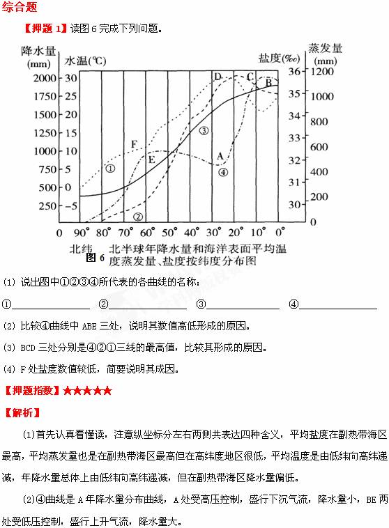 (4)F处位于北半球温带海区,多气旋雨和锋面雨,降水量大于蒸发量,加之有大量陆地径流汇入,故盐度较低。