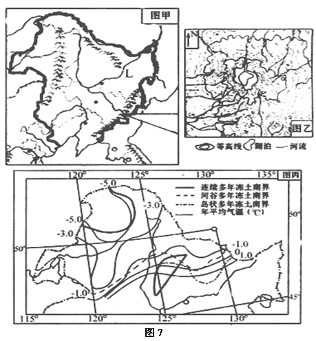 [押题2]图7中图乙为图甲某地的等高线图, 图丙是图甲中部分地区的多年冻土南界分布图,结合三图回答有关问题。
