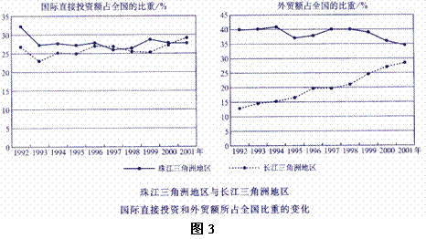读图3“珠江三三角洲与长江三角洲地区国际直接投资和外贸额所占全国比重的变化图”,回答19-24题: