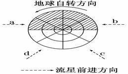 17.流星体闯入地球大气层,因同大气摩擦而产生光迹,被称为流星现象。下图中阴影部分为黑夜,虚线箭头表示流星进入大气层的方向。在流星体完全相同的情况下,从地球上观看流星更为明亮的情况最可能是