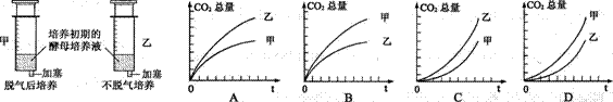 33.某小组为研究脱气对酵母菌在培养初期产气量的影响,进行了甲、乙2组实验,装置如右图所示,除图中实验处理不同外其余条件相同。一段时间内产生CO2总量的变化趋势是( )![]()