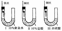 为研究金属腐蚀的条件和速率,某课外小组学生用金属丝将三根大小相同的铁钉分别固定在图示的三个装置中,再放置于玻璃钟罩里保存一星期后,下列对实验结束时现象描述不正确的是