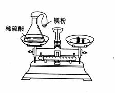 (6分)某学生在课外研究性学习活动课上用如图所示的装置做实验,瓶内放了足量的硫酸,可充气的气球放有一定量的镁粉,将它紧紧套在瓶口上,放在托盘天平上称量,质量为W1,然后将气球内的镁粉全部倒入瓶内,立即产生气体,气体逐渐胀大,充分反应后最终再次称量,质量为W2,结果W1>W2,试分析: