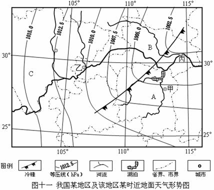 (1)判断此时图中甲城市的风向,并指出锋面系统过境后该地的大气状况(气温、气压、天气)的变化。(5分)