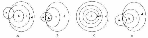 3.鸦片战争后,英、法、美分别强迫清政府签订了《南京条约》、《南京条约》附件、《望厦条约》和《黄埔条约》,如果把这四个条约的内容依次看成a、b、c、d四个集合,那么下列表示它们之间关系的图示正确的是 ![]()
