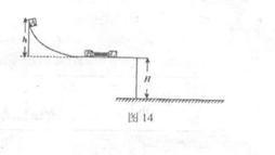 (12分)如图14所示,一轻质弹簧的一端固定在滑块B上,另一端与滑块C接触但未连接,该整体静止放在离地面高为H的光滑水平桌面上。现有一滑块A从光滑曲面上离桌面h高处由静止开始下滑,与滑块B发生碰撞并粘在一起压缩弹簧推动滑块C向前运动,经一段时间,